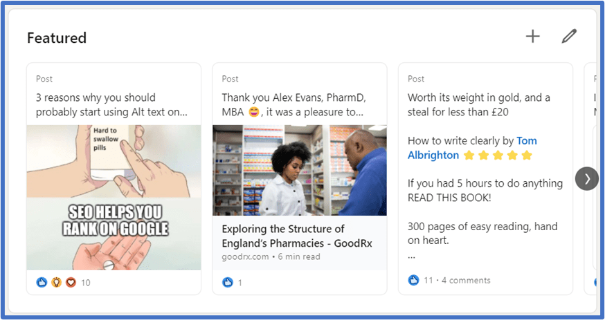 - When you post on LinkedIn, you can feature your posts on your profile. It’s a good idea to post about your achievements or pieces of work from your portfolio, or publications. Maybe even books or an article you’ve read recently, and a short review.