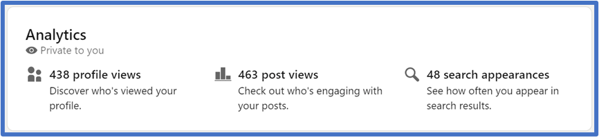 On your profile, LinkedIn shows a summary of how many profile views you’ve had, and how many times you’ve appeared in search.