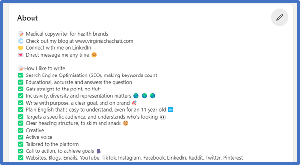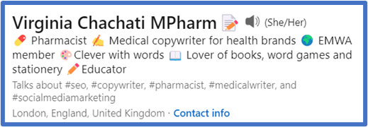 - For example here, I have put “Pharmacist” and “Medical copywriter for health brands” as my primary keywords. I’ve also put #pharmacist and #medicalwriter underneath. To get hashtags, you need to “switch on” creator mode on your LinkedIn profile.