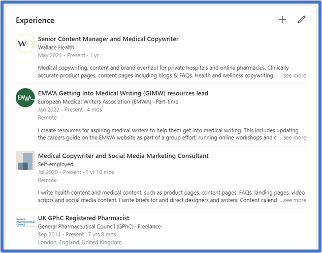 - Keep your experience section up to date, with around 2 to 5 years worth of relevant work experience. If you freelance or provide other services, create a section for it here so it’s visible 😊