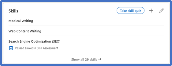 - Add as many skills as you can think of in your “Skills” section. It’s awesome if you can complete a “LinkedIn skill assessment” to test your knowledge on a particular skill and get a badge for your profile.